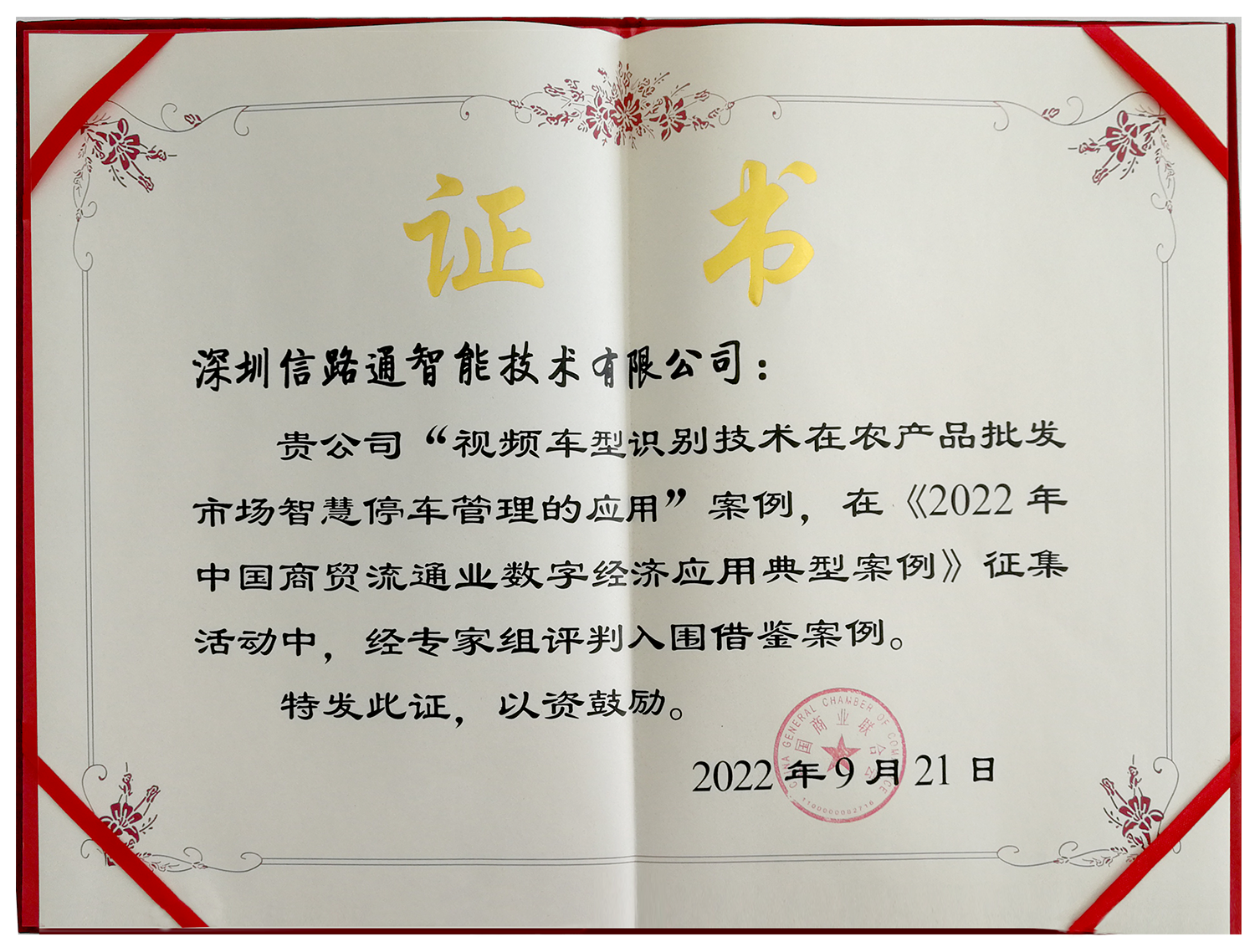 中國商業(yè)聯(lián)合會為切實貫徹國家促進數(shù)字經(jīng)濟發(fā)展戰(zhàn)略規(guī)劃,挖掘商貿(mào)流通業(yè)中數(shù)字經(jīng)濟在新技術、新場景等方面的典型應用做法,開展典型案例的評選活動,經(jīng)由行業(yè)專家、學者組成的專家組在創(chuàng)新性、可操行性、商業(yè)模式、技術含量、發(fā)展空間等五個方面的綜合研判,信路通“視頻車型識別技術在農(nóng)產(chǎn)品批發(fā)市場智慧停車管理的應用”案例入選。