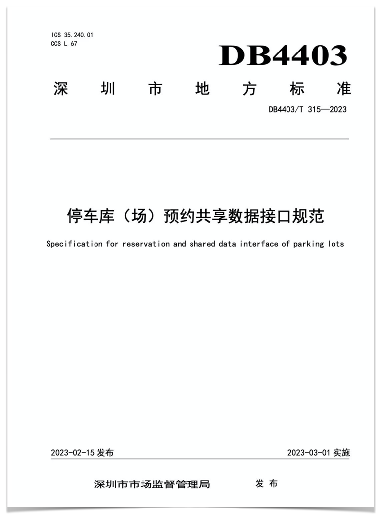 深圳市地方標準DB4403/T 315—2023《停車庫(場)預約共享數(shù)據(jù)接口規(guī)范》規(guī)定了停車庫(場)預約共享停車業(yè)務的總體要求、功能要求、數(shù)據(jù)接口要求、數(shù)據(jù)傳輸要求,適用于深圳市范圍內(nèi)停車庫(場)管理系統(tǒng)或停車管理平臺與預約共享停車平臺之間的數(shù)據(jù)交換以及功能設計與開發(fā),為深圳市預約共享信息化建設提供了標準化的指導。