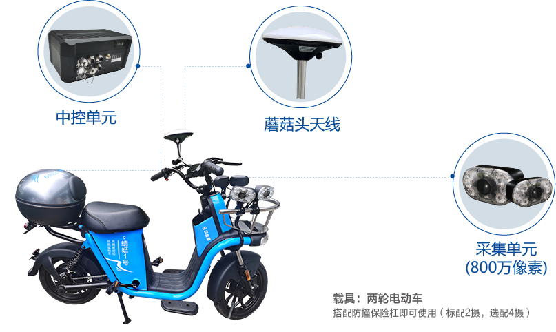 四攝款為選配款,該款一共四個前端采集單元,右前攝和右后攝與雙攝款一致,另外兩個前端采集單元安裝在兩輪巡檢車左側(cè),以適應(yīng)一些較窄車道泊位設(shè)置在左側(cè)的場景。