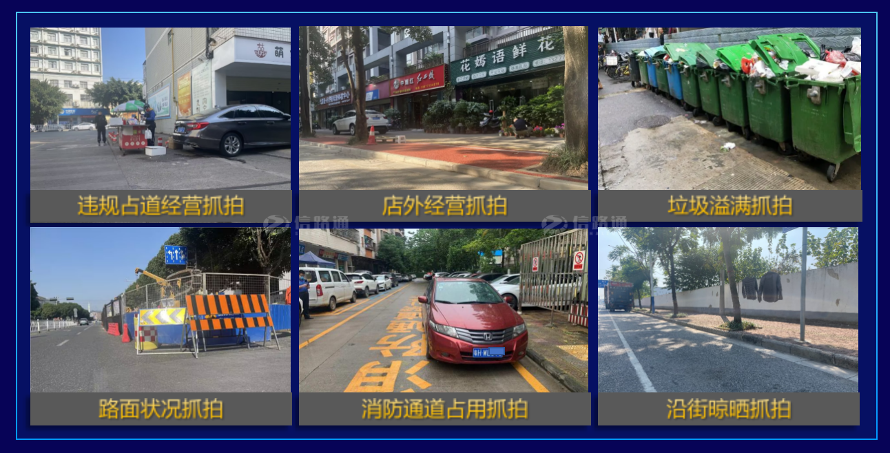 “新一代”視頻巡檢車還可以進行AI典型城管秩序類抓拍:違規(guī)占道經營、店外經營、垃圾溢滿、路面狀況、消防通道占用、沿街晾曬等。