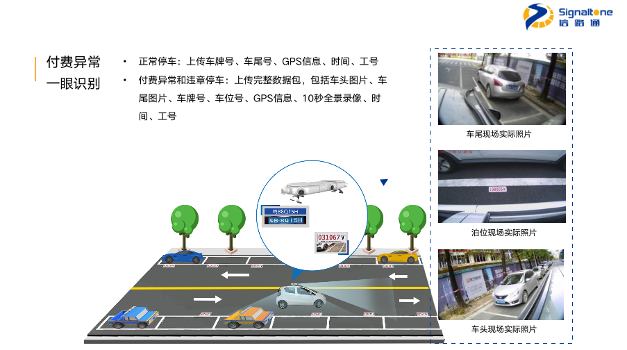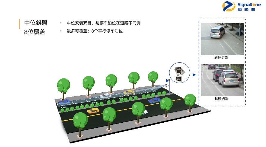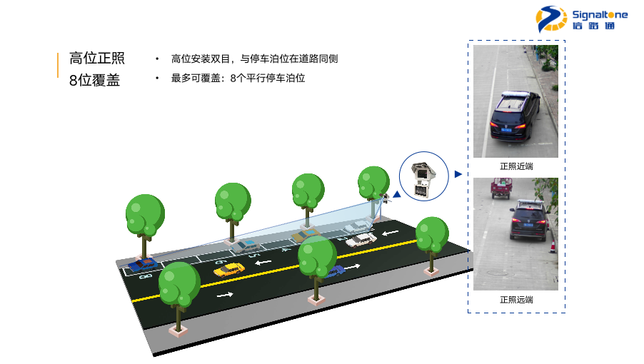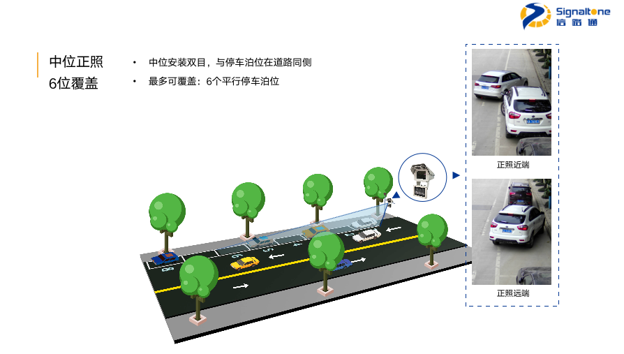 “雙目”采用500萬(wàn)的高清雙攝像頭,對(duì)平行于道路行進(jìn)方向設(shè)置的停車(chē)泊位進(jìn)行智能管理。核心指標(biāo)上,雙目車(chē)輛捕獲率超97%,車(chē)牌識(shí)別率超98%,多檢率低于5%。根據(jù)現(xiàn)場(chǎng)環(huán)境可選擇高位或中位安裝,左邊是我們高位正照的效果圖,一個(gè)雙目可覆蓋8個(gè)泊位,右邊是遠(yuǎn)近兩端的正照。接下來(lái)是可覆蓋6個(gè)泊位的中位正照效果圖及遠(yuǎn)近兩段的正照,以及可覆蓋8個(gè)泊位中位斜照效果圖及遠(yuǎn)近兩段的斜照。