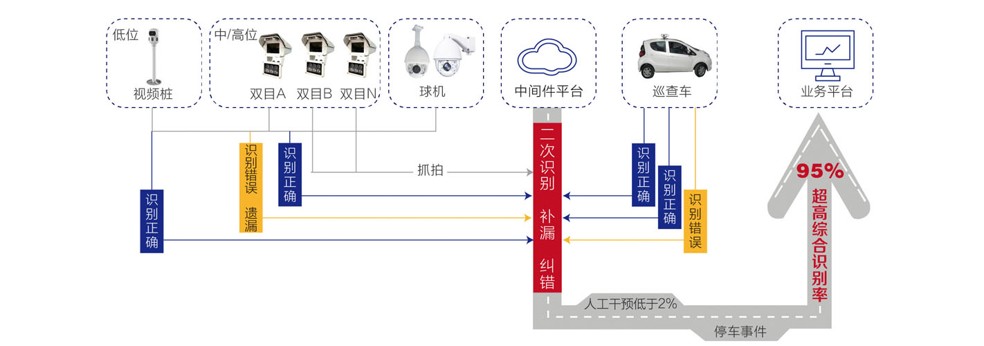 向下統(tǒng)一管理多種類多數(shù)量的視頻識(shí)別設(shè)備,向上使用簡單方便的接口協(xié)議對(duì)業(yè)務(wù)平臺(tái)推送準(zhǔn)確可靠的停車數(shù)據(jù),更可拓展二次識(shí)別功能,對(duì)視頻識(shí)別設(shè)備返回的數(shù)據(jù)進(jìn)行再次識(shí)別,95%超級(jí)綜合識(shí)別率遙遙領(lǐng)先。